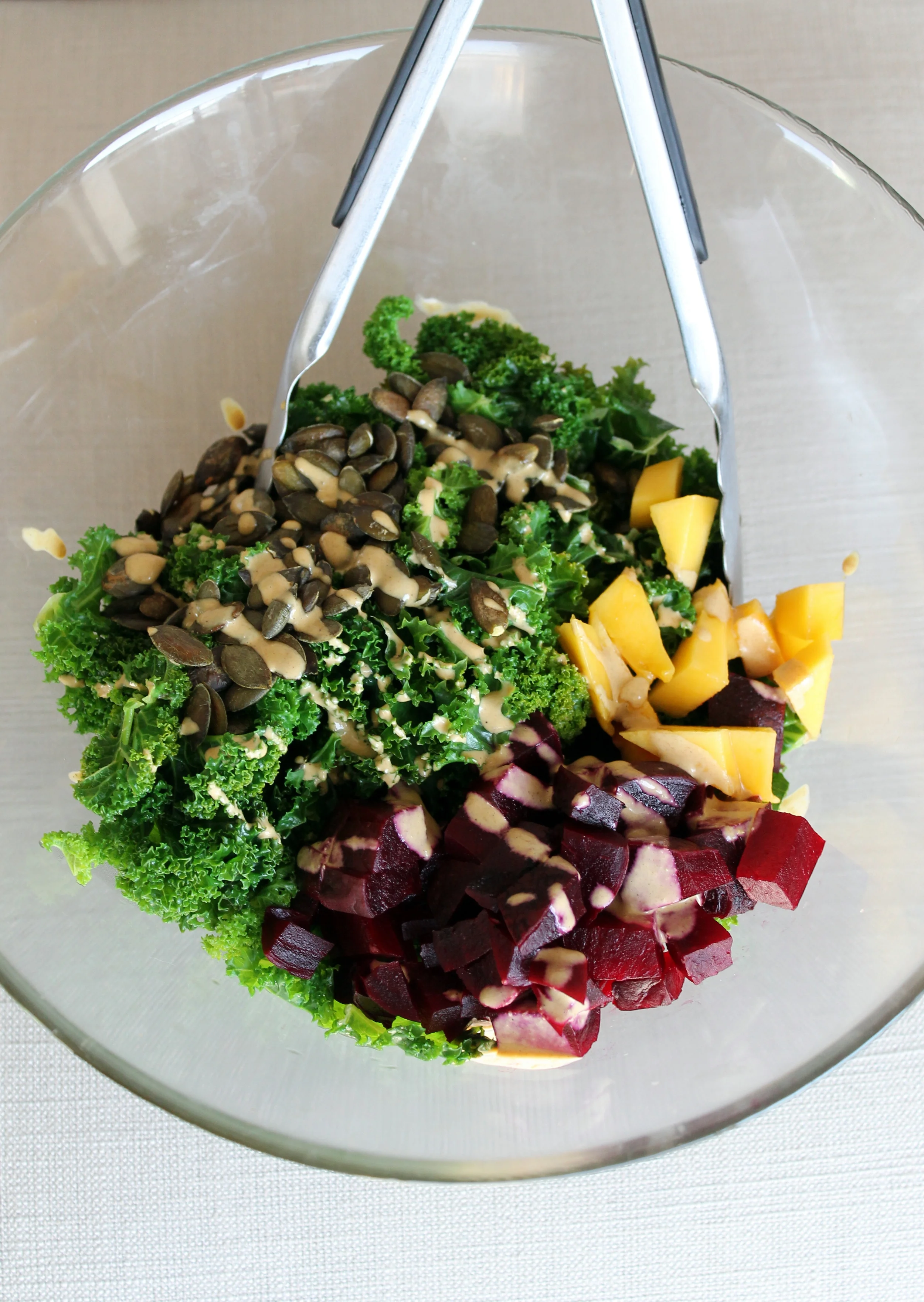 This is a no-recipe recipe. But it's one of those rare green salads that is hearty and keeps exceptionally well in the fridge for a few days, making it perfect to add quick greenery at lunch, serve as a dinner side salad, or have as a snack. And yes, I really mean a snack! I know what you're thinking though. Salads aren't usually what come to mind when I reach for a snack either. But when this has been stashed in the fridge I've found myself grabbing it in the afternoons out of convenience and finding it really hits the spot. Between the sweet, creamy tahini dressing, mango, crunchy beets and pumpkin seeds, this salad has the power to satisfy sweet and crunchy cravings while providing an impressive boost of calcium, protein, blood-purifying chlorophyll, and fiber, to name just a few. That's a lot to ask of a little salad, but this one is up for it.