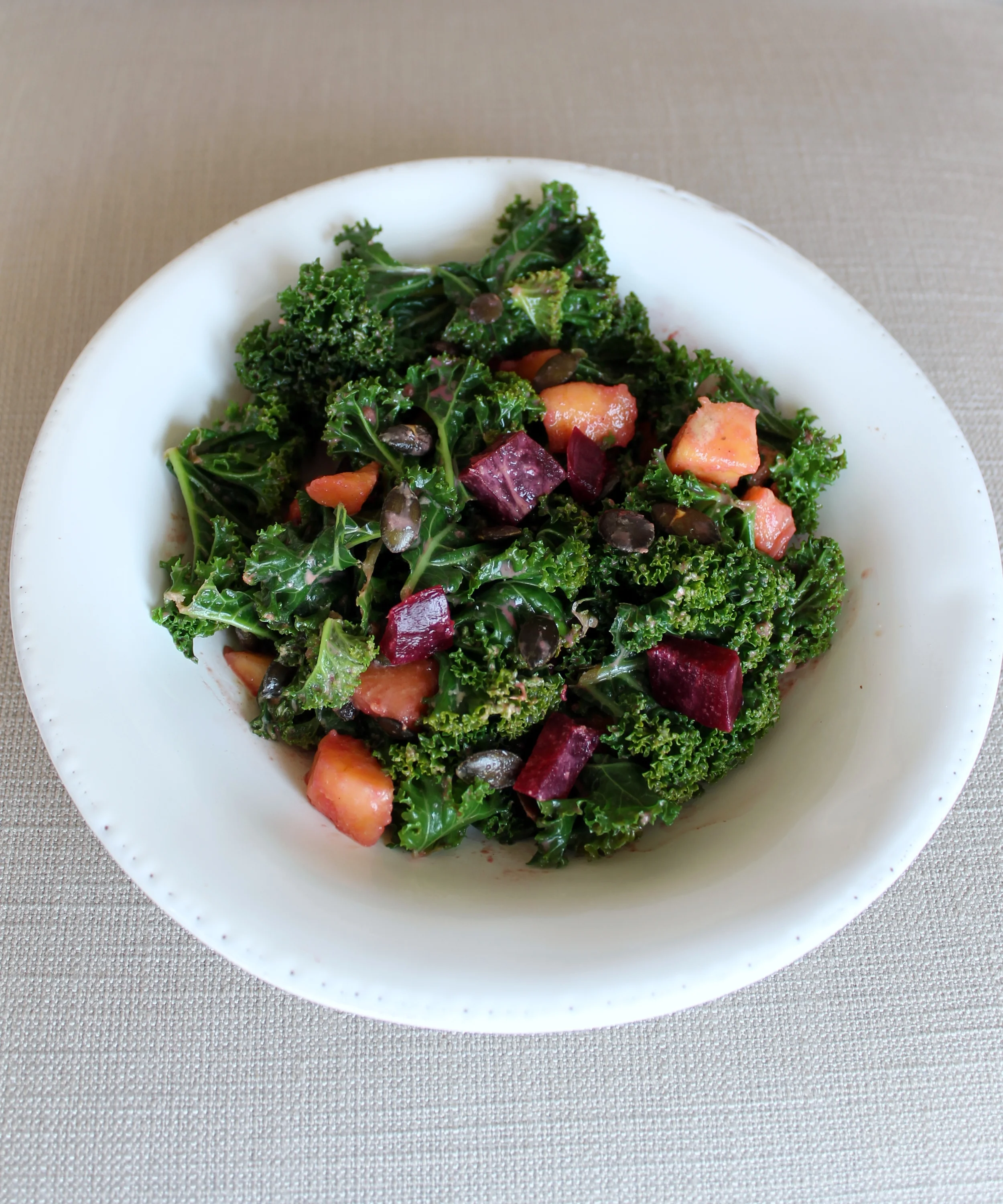 Notes: I make this salad often and prefer using raw grated beets. However, I took pictures when I tried it with roasted beets and they work as well if that's all you have on hand. If kale is not available, a large head of steamed broccoli would be a good substitute.